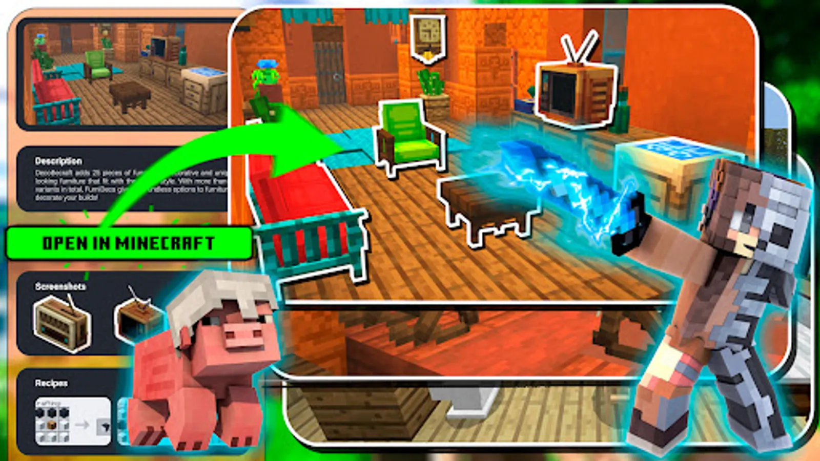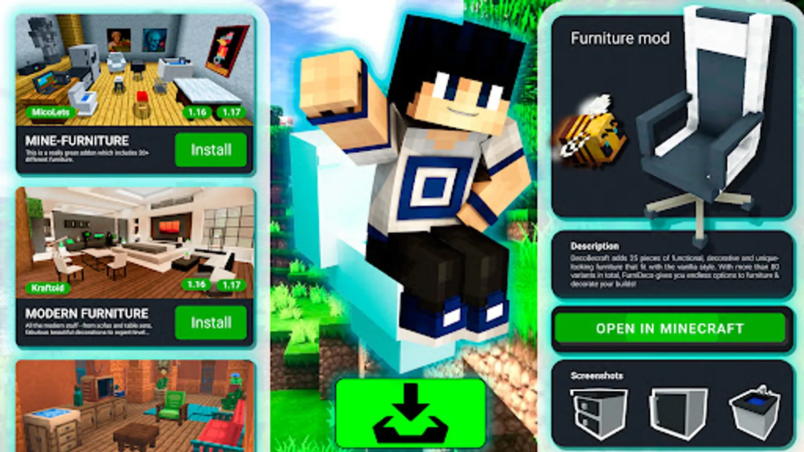 Furniture addons for Minecraft will allow you to increase your interest and bring new colors to the gameplay. Everyone will find furniture to their liking. And most importantly, there are furniture mods for almost every version of Minecraft. Select your version from the drop-down menu and set exactly the darkness that suits you and will work for you. Decorated maps and furniture mods are very easy to install. It is enough to choose the mod for MCPE you like and click install. Just one click. After that, it remains to open game and create your own world with new additions.