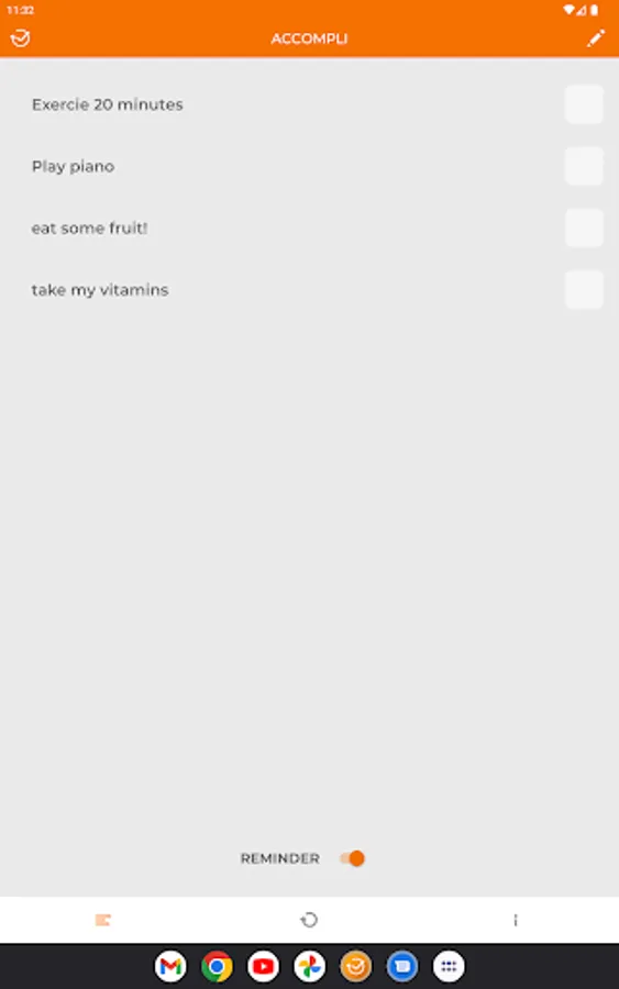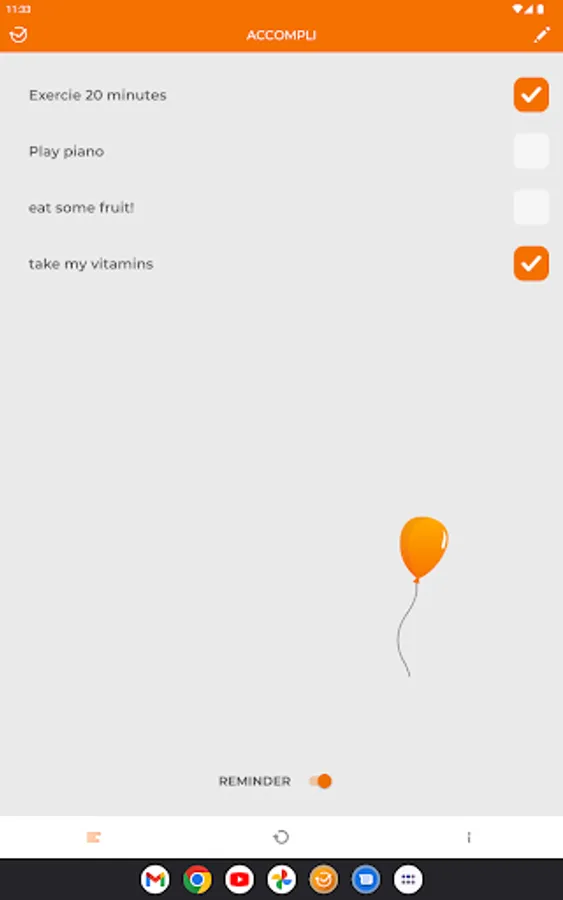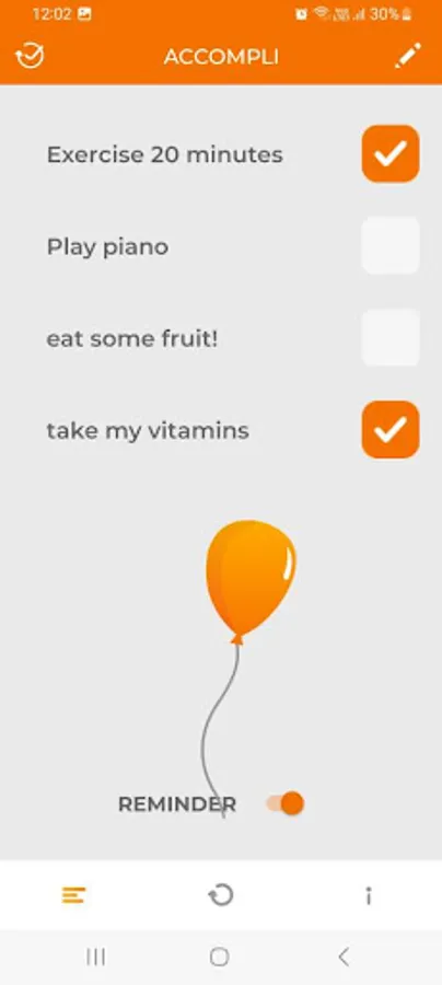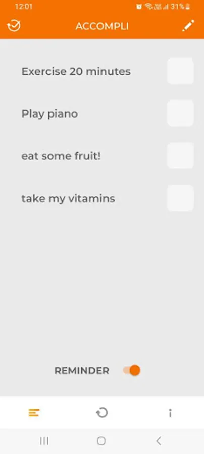 Enter from 1 to 5 accompli in the app and check them off as you complete them each day. The check marks will be cleared at midnight each day and you have an option to be reminded at 6pm if your accompli are not completed at that time.
