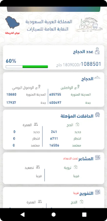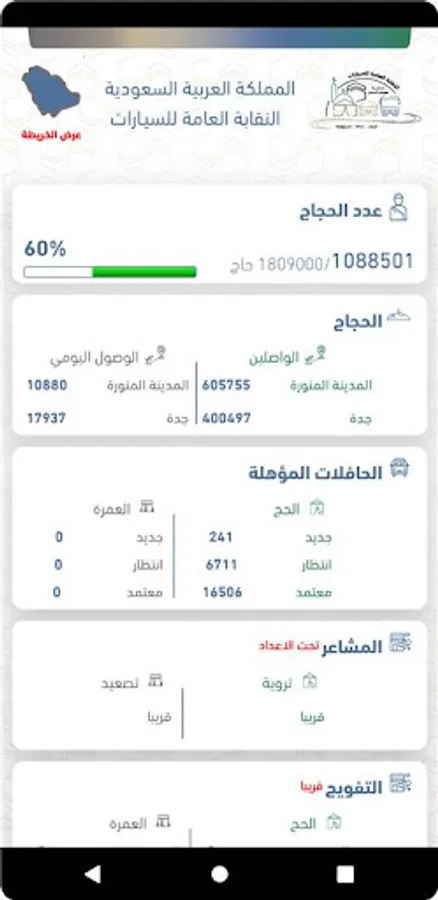 An application for senior management in the General Syndicate of Cars, to display statistics on pilgrims arriving in Makkah and Madinah and qualified buses, with a map showing the locations of the buses