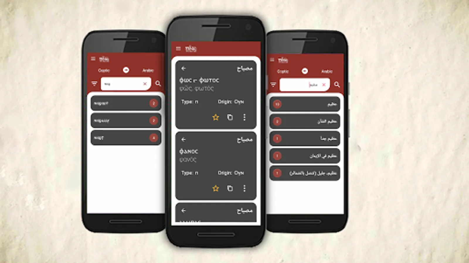 Naqlun Coptic Dictionary comes with a brief user manual to make you find the best usage of the app, as it helps you to know the origin and the type of the Coptic translated definition with just a tap.