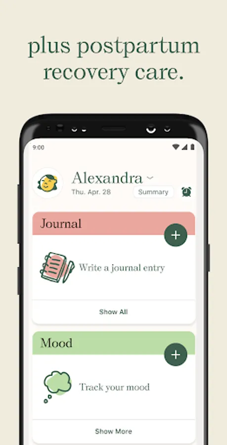 - Track postpartum recovery directly in the app. Keep track of medication immediately after delivery and water intake, sleep, mood, and journaling throughout your postpartum journey.