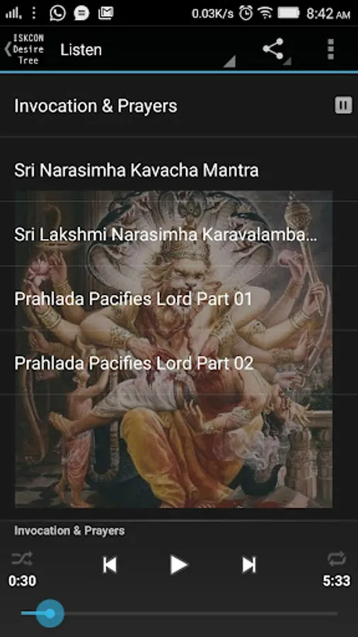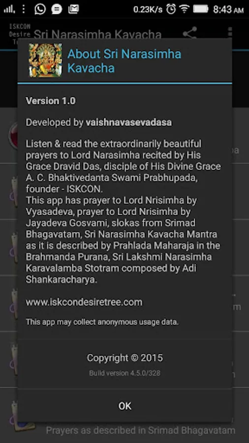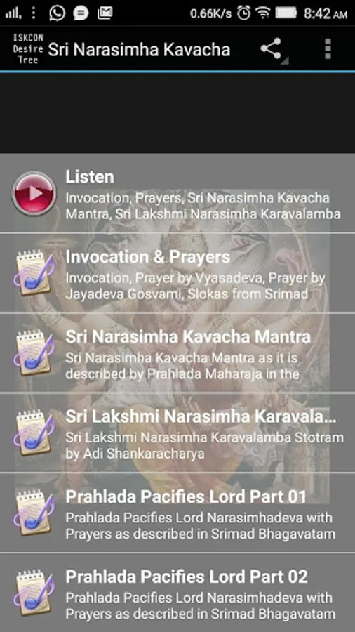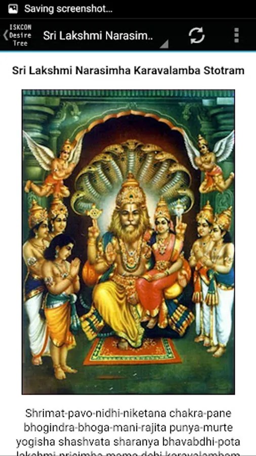 This app has prayer to Lord Nrisimha by Vyasadeva, prayer to Lord Nrisimha by Jayadeva Gosvami, slokas from Srimad Bhagavatam, Sri Narasimha Kavacha Mantra as it is described by Prahlada Maharaja in the Brahmanda Purana, Sri Lakshmi Narasimha Karavalamba Stotram composed by Adi Shankaracharya.
