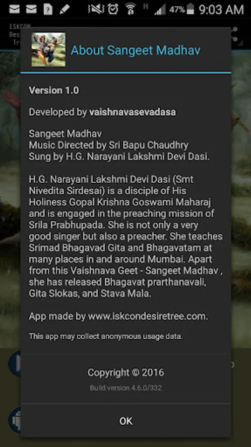 H.G. Narayani Lakshmi Devi Dasi (Smt Nivedita Sirdesai) is a disciple of His Holiness Gopal Krishna Goswami Maharaj and is engaged in the preaching mission of Srila Prabhupada. She is not only a very good singer but also a preacher. She teaches Srimad Bhagavad Gita and Bhagavatam at many places in and around Mumbai. Apart from this Vaishnava Geet - Sangeet Madhav , she has released Bhagavat prarthanavali, Gita Slokas, and Stava Mala.