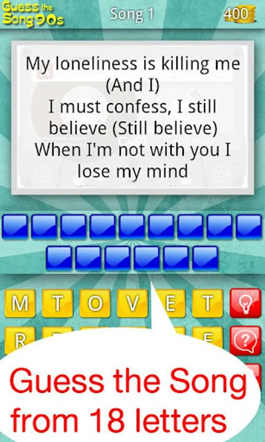 Guess the Song 90s are the game that let you read the lyric and guess the song with 18 letters and watching online Music Video.