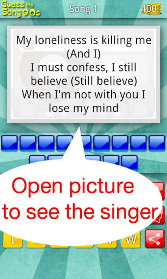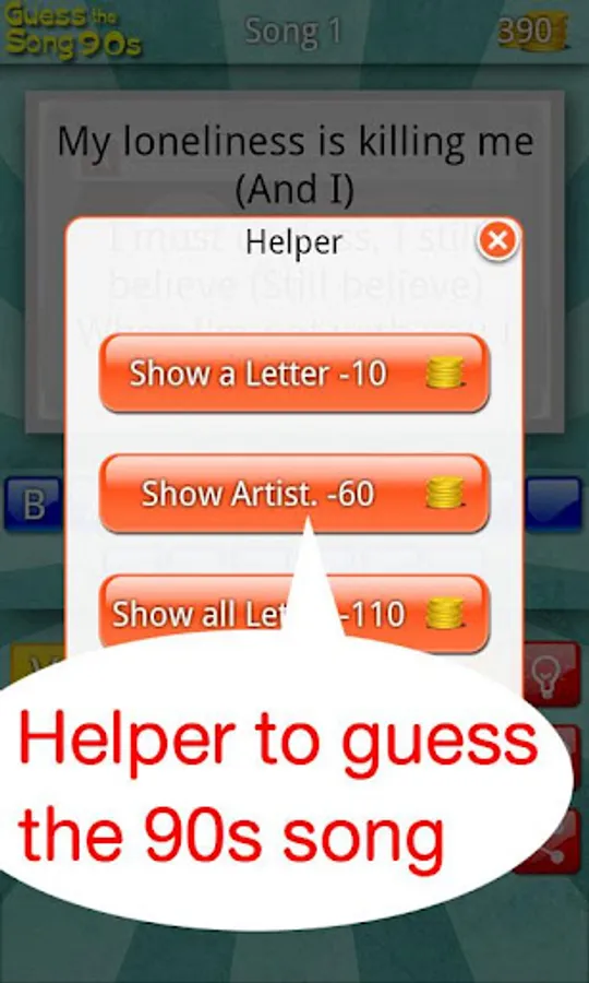 Let 's guess the song the Hint to show the artist or song name and use Helper to show the letters, the picture of artist, and show all the song name.