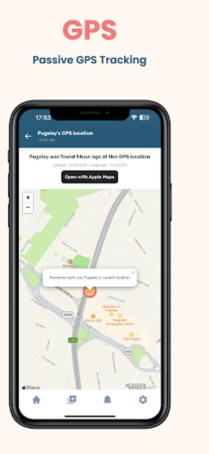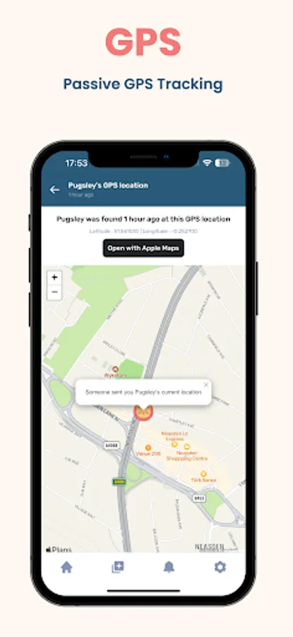 - Easily upload that location to Apple Maps and get directions to your pet as soon as possible.