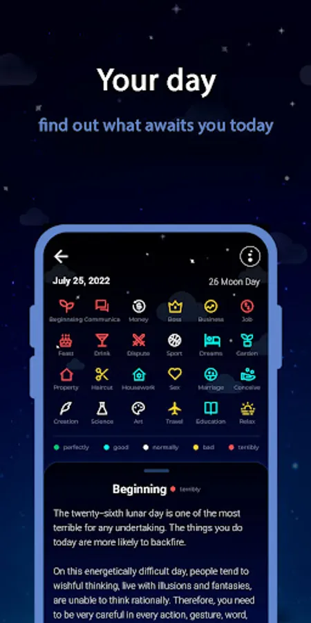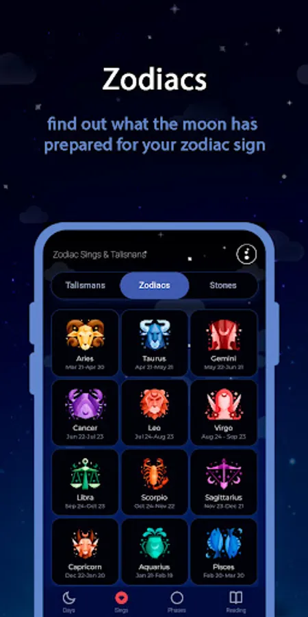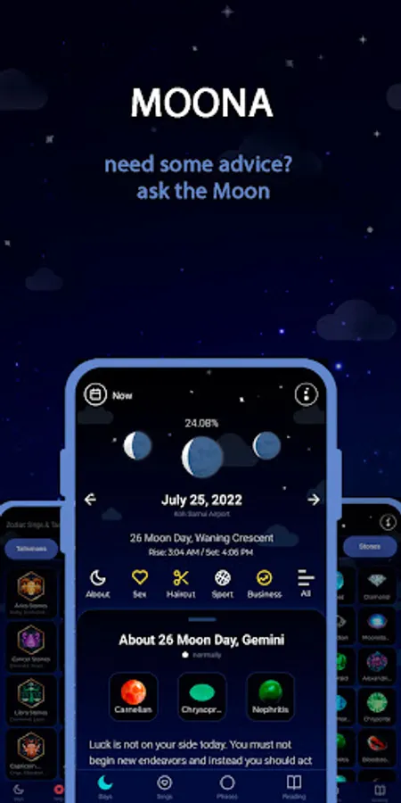 Moon Phase Calendar ◐ MOONA is a great lunar calendar tracking app. Contains the phases of the moon, the calendar of lunar days, the time of moonrise and moonset, the position of the moon in the signs of the zodiac, the description of precious stones according to the signs of the zodiac, talismans. Description of auspicious and inauspicious days. 24 different categories such as love, haircut, business meetings, communication with the boss, job change, sports…