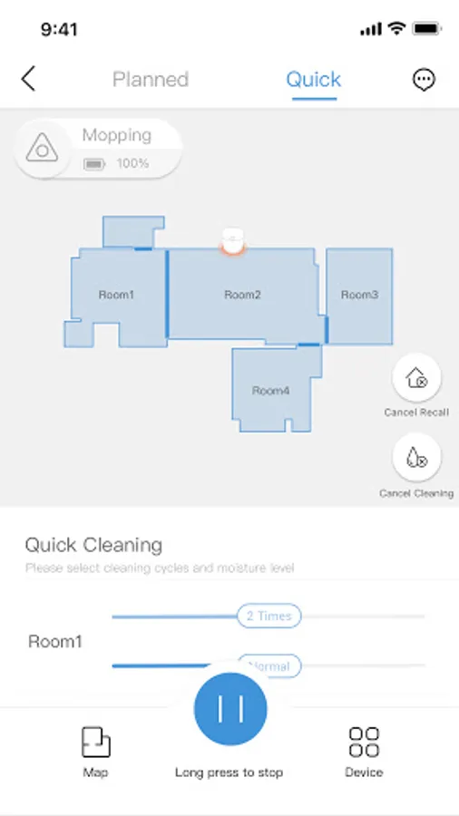 Users can choose which rooms to clean, number of cleaning times, mop moisture level and other options; design exclusive cleaning plans for different scenarios.