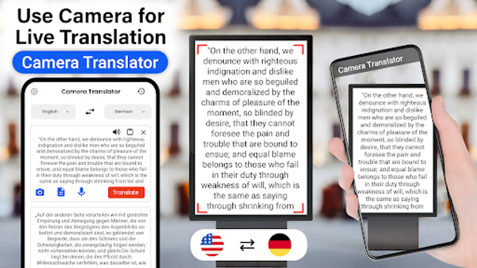 Camera translation: Point your camera at signs for language transfer from English to all language translate. Photo translator capture image and recognize text and translate all with addition of talk to translate or text translate for you.