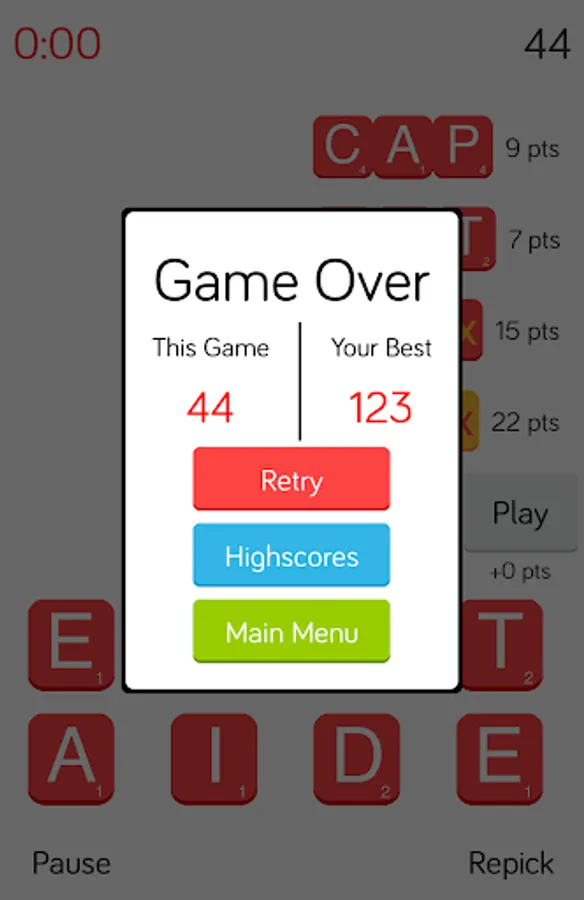 Earn as many points as you can in one minute. For each word you make, five more seconds are added on to the clock! Unlock new letter colors by getting the best score you can! A new color is unlocked at 300, 500, 750, 1000, 3000, and 5000 points.