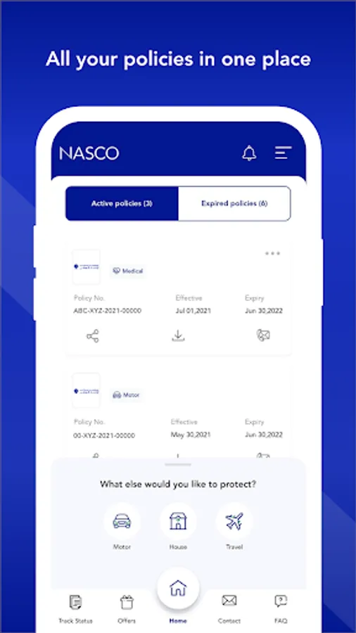 Nasco Connect provides you with the details of your medical, motor, travel and home insurance policies. You can also request quotation and purchase new policies in seconds.