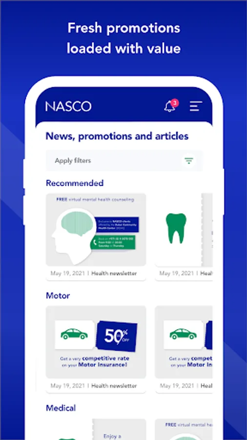 Articles and bulletins related to health, wellness and other insurance related topics are available inside the app, along with various offers and promotions for the users. Nasco Connect recommends you suitable insurance products based on your profile and saves you time.