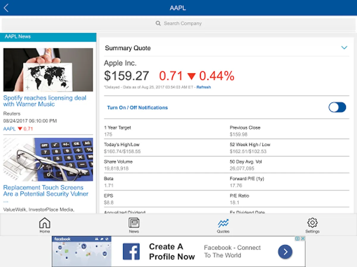 • Select the “Summary Quote” view to key information about your favorite stocks; including: Market Cap, 1 year target, P/E Ratio, Forward P/E (1 yr), EPS, Beta, Dividend, Company description, ETFs where your stock is a top ten holding and the performance of that ETF over the past 100 days