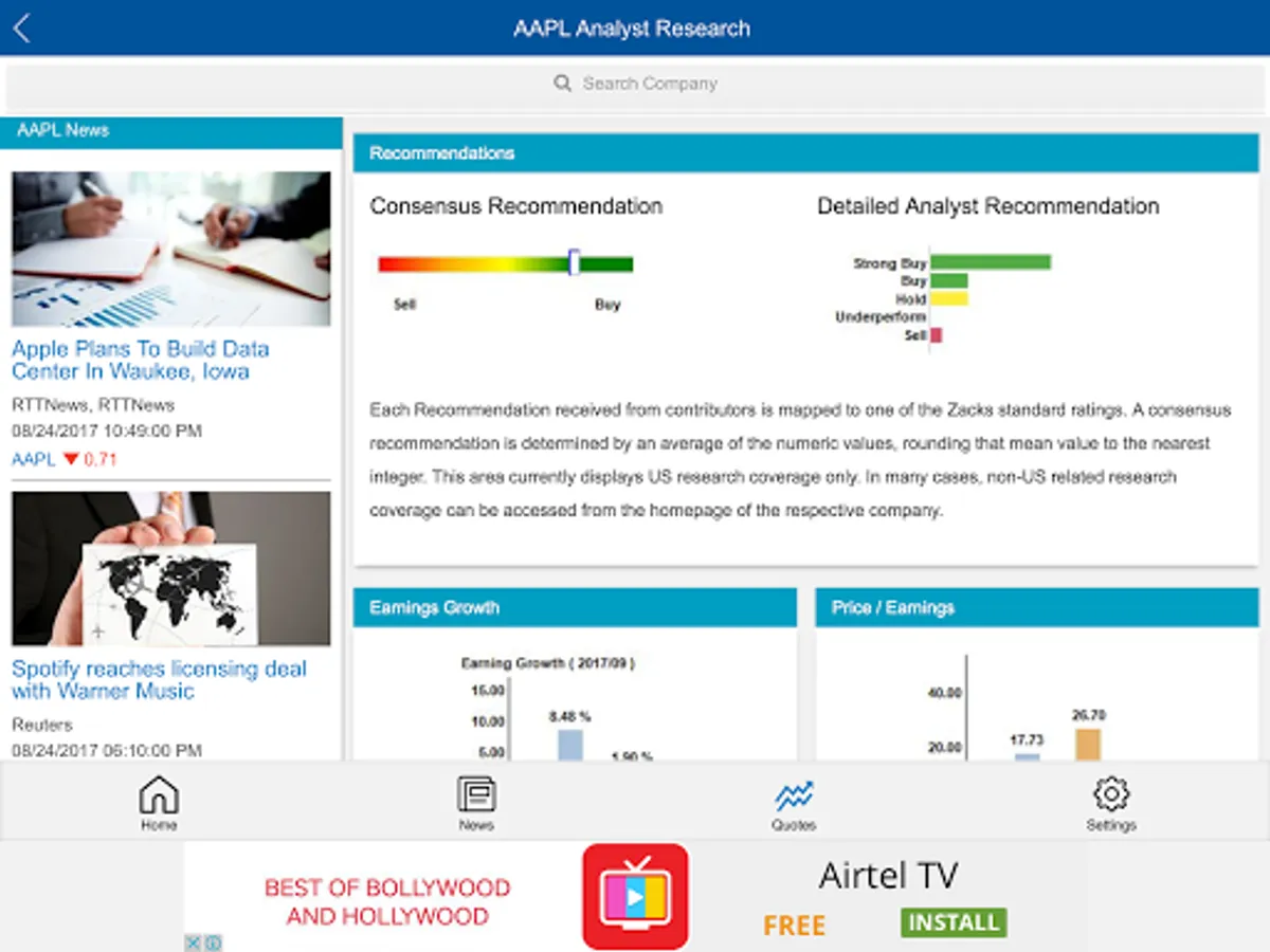 • Visualizations for Consensus Recommendation, Detailed Analyst Recommendations, Earnings Growth, Price / Earnings, Earnings Surprise, Detailed Estimate Forecast, and PEG ratio.