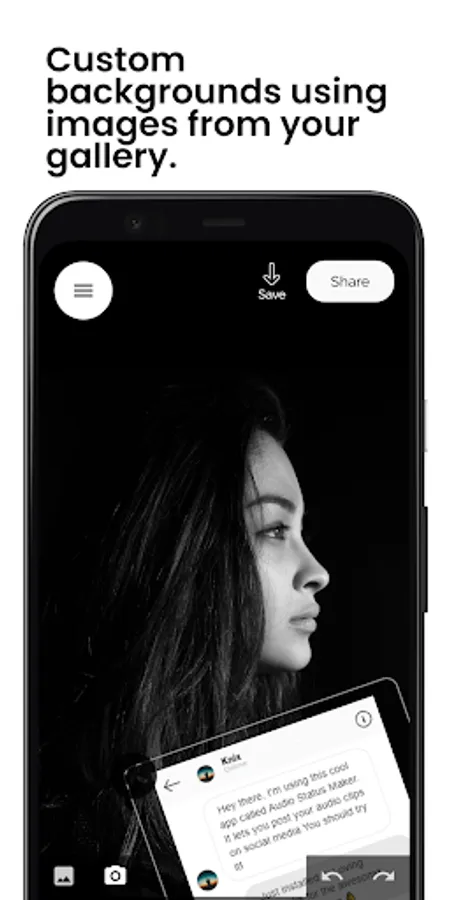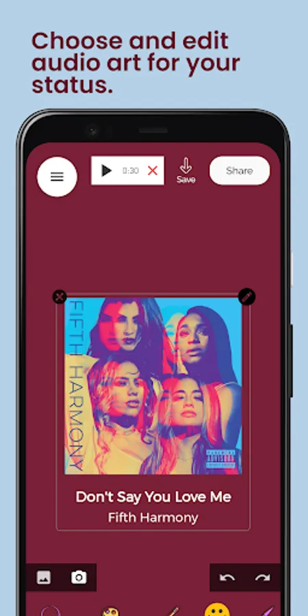 Have you ever wished that you could easily post that part of a song or audio that you think is amazing . Well Audio Status Maker lets you do just that. With Audio Status Maker you can pick or record audio from your library, trim the audio to pick the part that you want to share and then convert it to an audio status by either choosing from a selection of several backgrounds available in the app or use your own custom image as the background. You can then show off your creativity by adding text, stickers, filters or drawings on top of your status to give it that extra edge. You can share this status on WhatsApp or any other social media platform and it will work! Try it. Gone are the days when you would need to cover the camera just to post yourself singing.