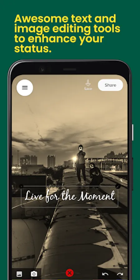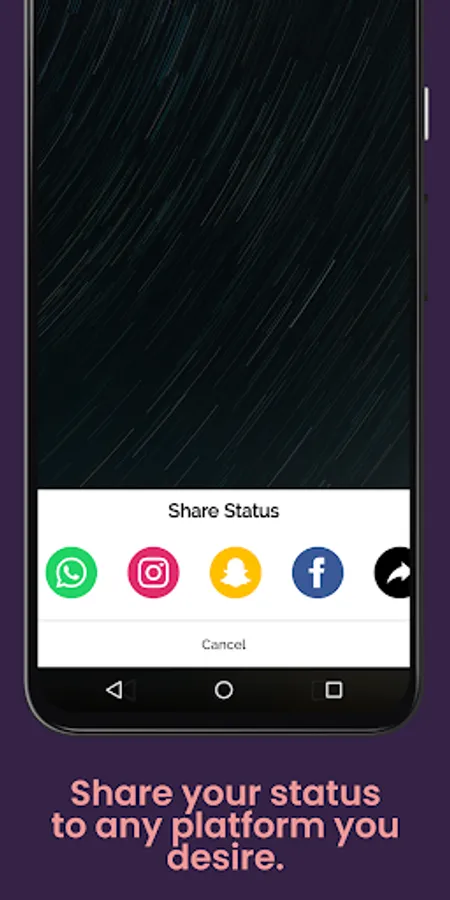 Includes several crisp, bright and colorful backgrounds for your status. Also lets you create a status using your own custom images from gallery or camera as the background.