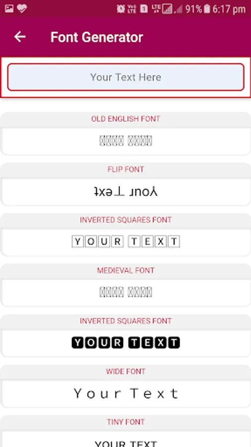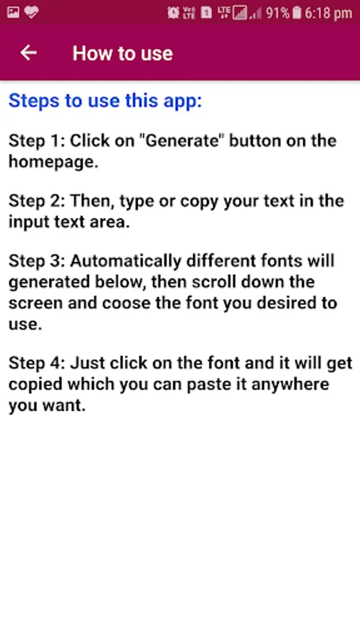 Using this app is super easy, just type or paste your normal text on the input text area. After that various fonts will get generated automatically from which you can select your desired font. Then click on the font in order to copy it and use this font anywhere you want.
