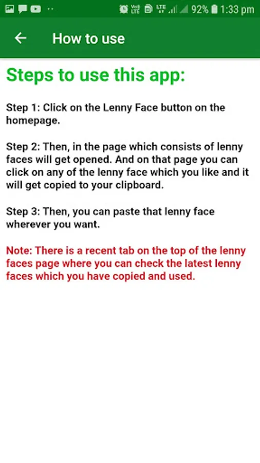 You can use this Lenny Face application easily, just click on the lenny face which you desire to copy and in turn it will automatically get copied to your clipboard and you can paste the copied lenny face anywhere according to your requirement.