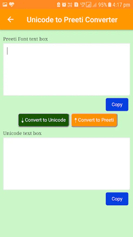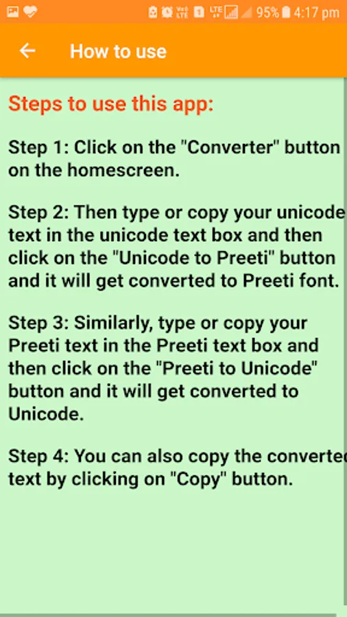 Its is very easy to use this app, you have to just type your Unicode text in the Unicode text box and then click convert, then it will get converted to Preeti font and same procedure can be followed for converting Preeti font to Unicode text.