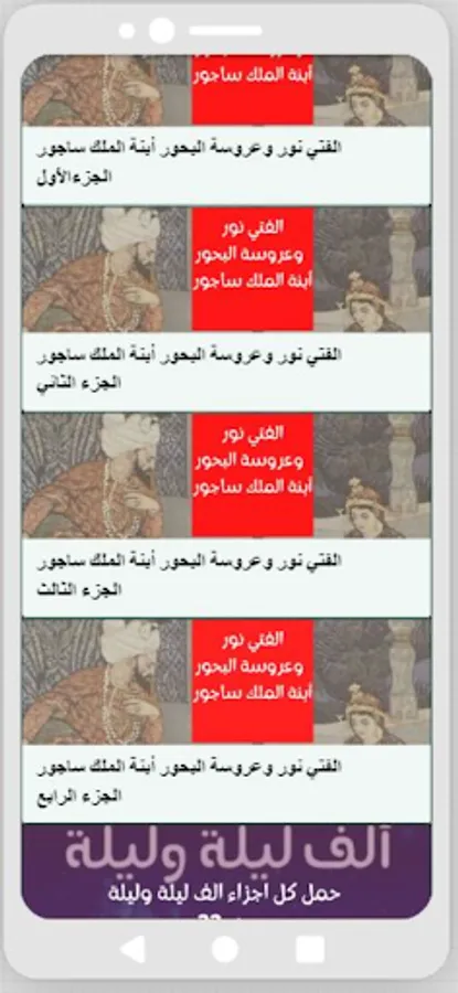 The application of the series One Thousand and One Nights is an Egyptian series that tells the stories of the Arabian Nights, known as the stories of One Thousand and One Nights, which are famous Arab stories over time in the East and the West. The Thousand and One Nights has many stories and tales that Scheherazade told King Shahryar over the course of a thousand nights in order to escape from murder at the hands of pleasure. Sayyaf, you can consider the Thousand and One Nights application like an audio book that contains bedtime stories that listeners love. It is true that they are not real stories, but we as humans enjoy this type of fairy tale, so you will not find these stories on Lodinet or the site of a love story or anywhere else, you may find them in the application of the series One Thousand and One Nights, which is an Egyptian series that is considered one of the most wonderful Egyptian series that has You absolutely hear it, and one of the advantages of the application of the series One Thousand and One Nights is that it is without a net and it consists of 22 parts distributed over 22 applications that you can download respectively.