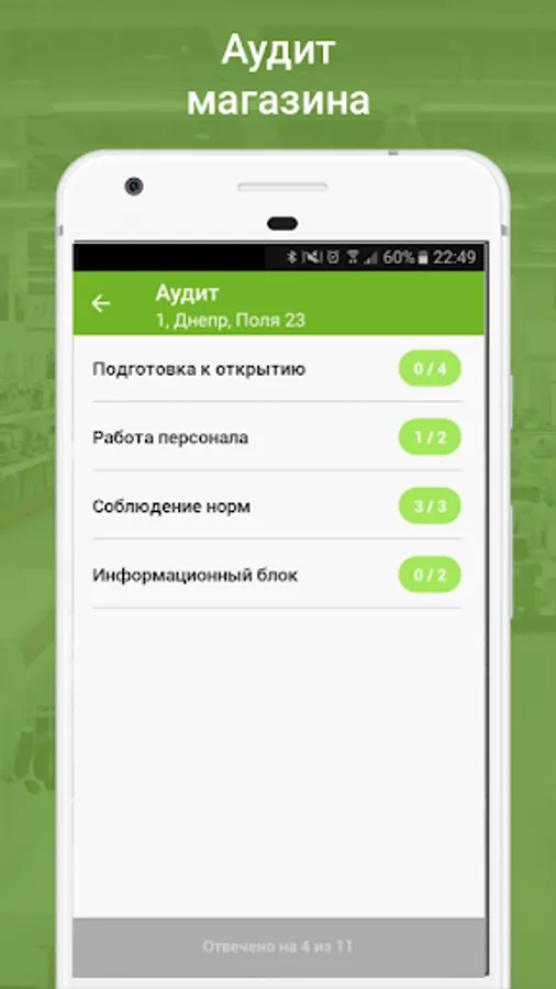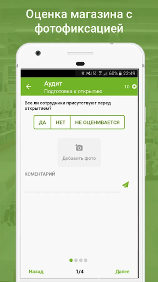 This application is designed for the audit of shops / retail and service outlets as full-time employees and mystery shoppers. It allows you to quickly fill in checklists, promptly report on audits and targets, transmit the results for analysis and processing.