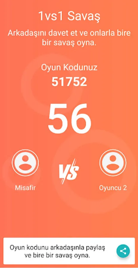 With Bilgin - Quiz, you can compete online one-on-one with your friends. You can create a room and invite your friend with the one on one competition option.