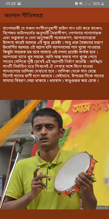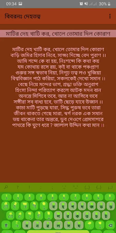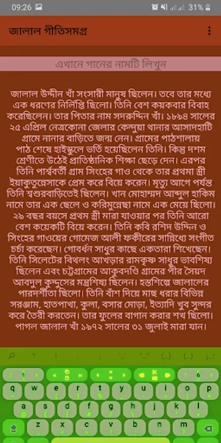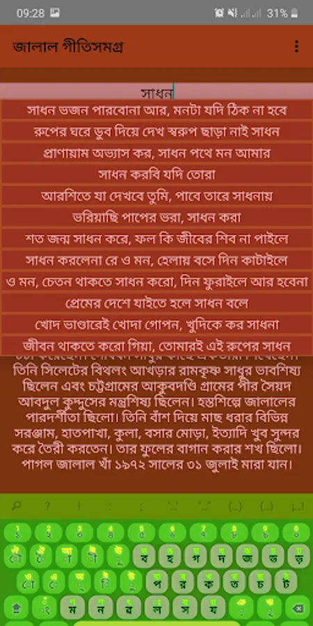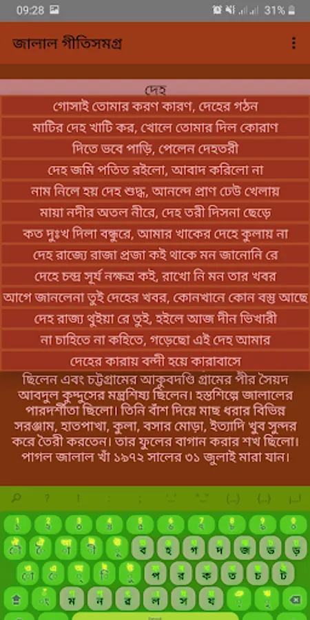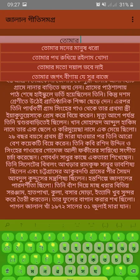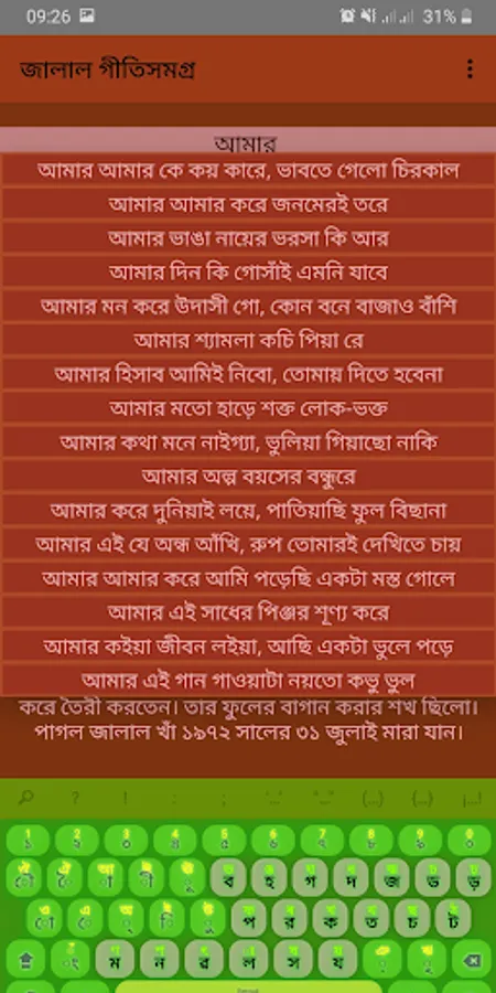 In this app, you will find more than 600 songs of Jalal Uddin Khan of Kendua police station of Netrokona district. It has a search system according to the name of the song. As soon as you write the first few letters of the song name, you will get the song you are looking for from the song list. You do not need to have an internet connection to use this app. This app can also be used completely offline. The words of the devotee have been presented in a very pleasant way. The color of the app has been selected keeping in view the style of the song. This app has been created especially for Sadhu Guru Vaishnavas of Gram Ganj, who practice Baul songs directly, practice Palagan all night long, so that they can easily find any song in a moment. Apart from the sad monks, the app will also bring benefits for the research of the wealthy researchers in the urban areas. If you like the app, don't forget to express your gratitude.