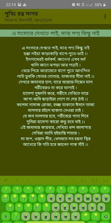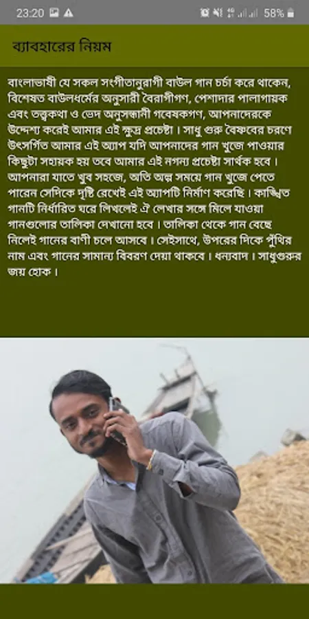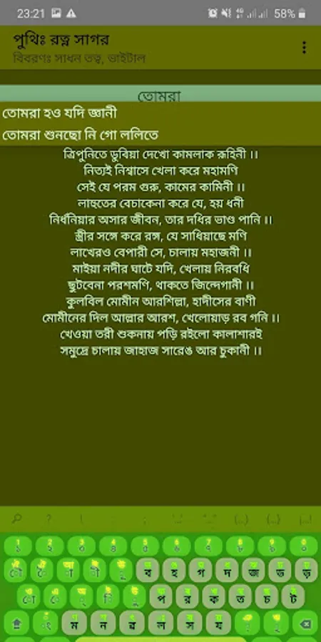 This app is the entire composition of Baul devotee Kalasha of Sylhet region. No internet connection is required to use it. Kalasha was born in the village of Pardabaj in the Bancharampur police station of Brahmanbaria district on the 20th of 1247 BS. Later he lived in Dhaipur village of Kulanj union of Dirai upazila of Sunamganj district. Kalasha's body shape was very beautiful. He was a handsome, healthy and brown man. The beard on his face was delayed up to his chest. In terms of education, he is known as the title side. He obtained it through the then Pir Jan Sharif Shah Baba of Sureshwar Darbar Sharif in Naria upazila of Shariatpur district. Kalasha had multiple marriages and was the father of five sons. His sons were named Manullah Shah, Marfat Shah, Manik Shah, Kajal Shah, and Badsha Shah respectively. His other daughter Sha Dudhraj Bibi has been carrying the spiritual legacy of her father by becoming the wife of the family. Kalasha died in 1958 at the age of approximately 110 years.