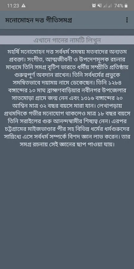Maharshi Manomohan Dutt is one of the proponents of interfaith harmony. Through his music, autobiography and exhortations, he made important contributions to the establishment of religious harmony throughout British India. He called the Lord of all religions by the name of Mercy. He was born on 10 Magh 1274 BS in Satmora village of Nabinagar upazila of Brahmanbaria and died on 20 Ashwin 1318 BS at the age of only 32 years. Although he was deeply interested in his studies at the beginning, at the age of 18 he became a disciple of Guru Anandaswamy of Sarail. Later, he came in contact with religious leaders of different religions including Maizbhandar Pir of Chittagong and gained detailed knowledge about all religions. Impressions are gained in a fluid, global, diffused way.