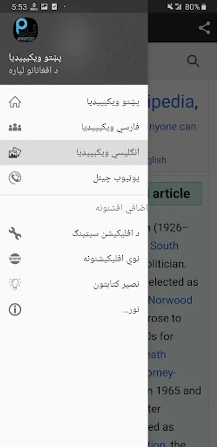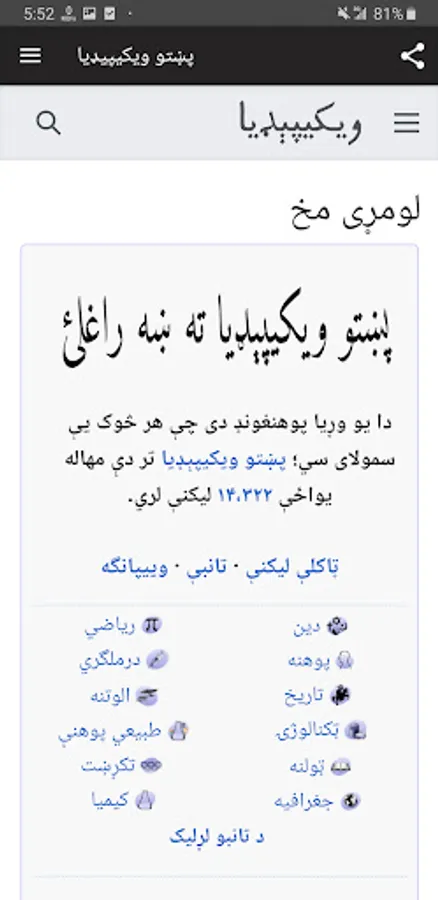 Welcome to Pashto Wikipedia for Android! You can install Pashto Wikipedia alongside your current version of Wikipedia for Android, so you can test our new features before they go live for all Wikipedia for Android users. Your feedback will help us fix bugs and decide what features to focus on next.