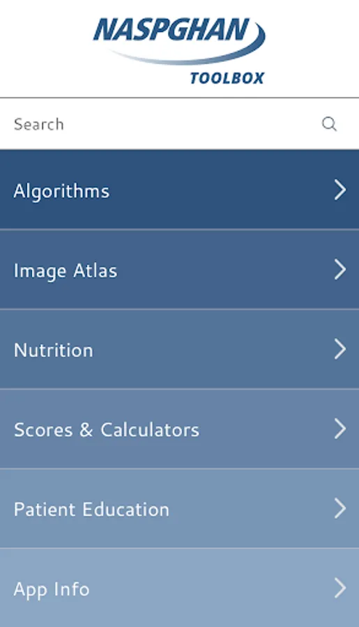 The NASPGHAN TOOLBOX is the official app provided by the NASPGHAN (North American Society for Pediatric Gastroenterology, Hepatology, and Nutrition) society. This app facilitates easy access to clinical guidelines for pediatric gastroenterologists and trainees. It is free to download on your phone or tablet. NASPGHAN TOOLBOX information will be continuously updated by the NASPGHAN Fellows committee to provide new and up-to-date information and clinical guidelines. Features of this app include the following sections: