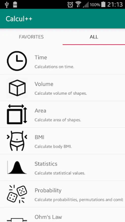 Calculator app that provides multiple useful calculators in multiple areas like calculating volume/area for different shapes, calculating statistical variables (mean, median, standard deviation, etc), calculating Body Mass Index, calculating voltage/current/resistance based on Ohm's Law, etc...