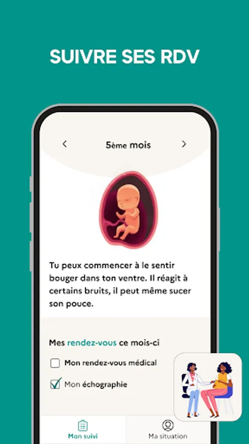 The user has a "my situation" page allowing her to find the information recorded in her profile, the appointments made during her pregnancy follow-up as well as her symptoms, if any.