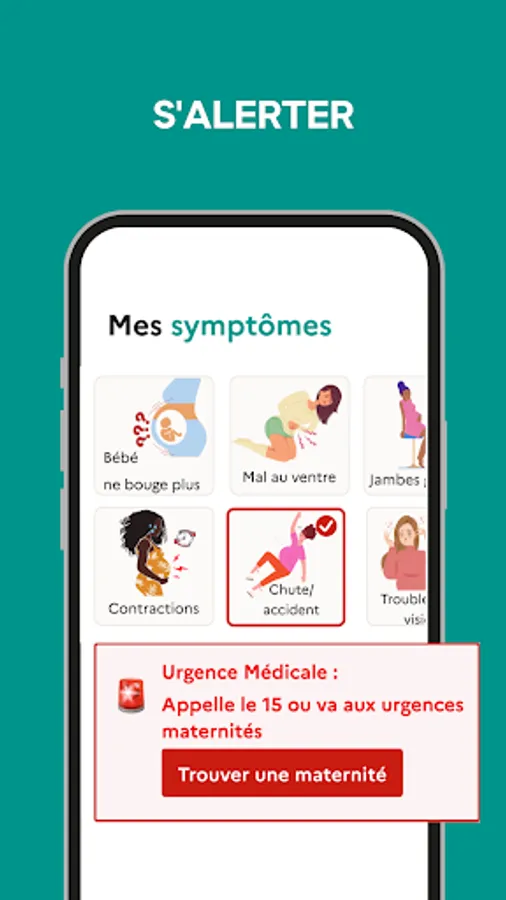 The user can indicate the symptoms to which she is prone. In the event of symptoms requiring rapid treatment, she will be directed to maternity emergencies.