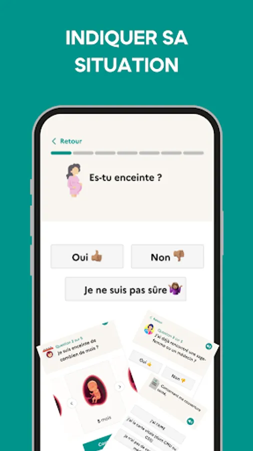 During the first connection, the user answers several questions about her social and medical situation. The answers given make it possible to target key messages and direct them to the right place and at the right time.