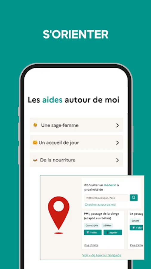 A section "my help around me" allows the user to find help adapted to her situation on different themes and near where she is at the moment T, via a geolocation device (in partnership with Solidguide)