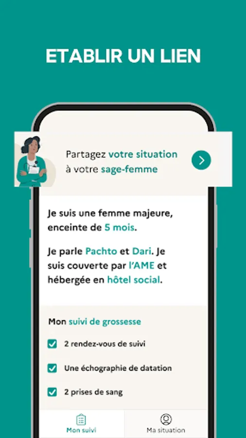 The user can, if she wishes, share her situation (in French) with the medico-social professionals she meets during her pregnancy journey. This feature facilitates communication if the user does not speak French, and establishes a bond of trust between her and the professional.