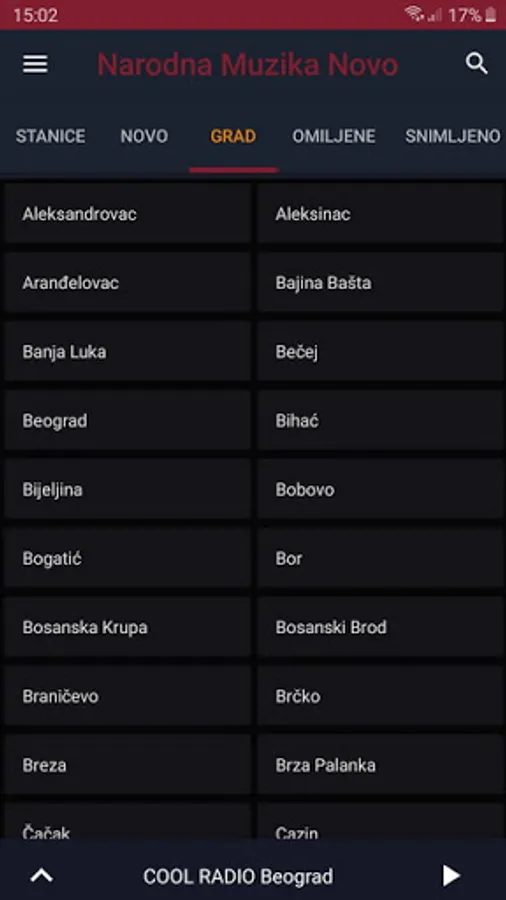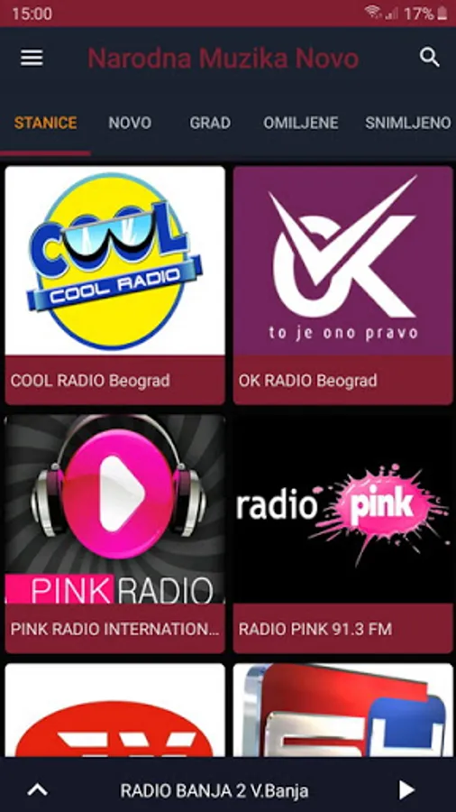 Radio stations from Serbia and Bosnia and Herzegovina, which broadcast folk music, on an Android phone. Internet is needed. The application has about 200 radio stations. After a few of the most listened to, other radio stations follow in alphabetical order.