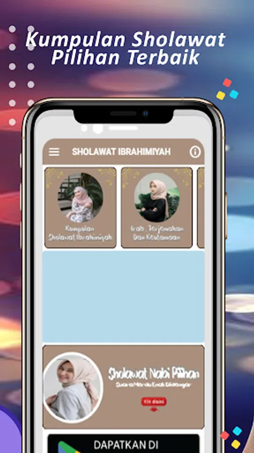 * Audio sholawat: Users can listen to sholawat through the high-quality audio available in the application. Some of the sholawat are also accompanied by a video showing the appearance of the artist or group that performs them, providing a deeper experience of feeling the beauty of the sholawat.