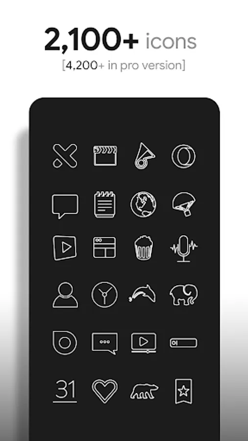 • 2,100+ hand crafted flat, clean & simple white flat HD Icons. Full version has 4,000 icons. The icon pack includes icons with many variations of default lined icons such as phone, contacts, camera, etc.
