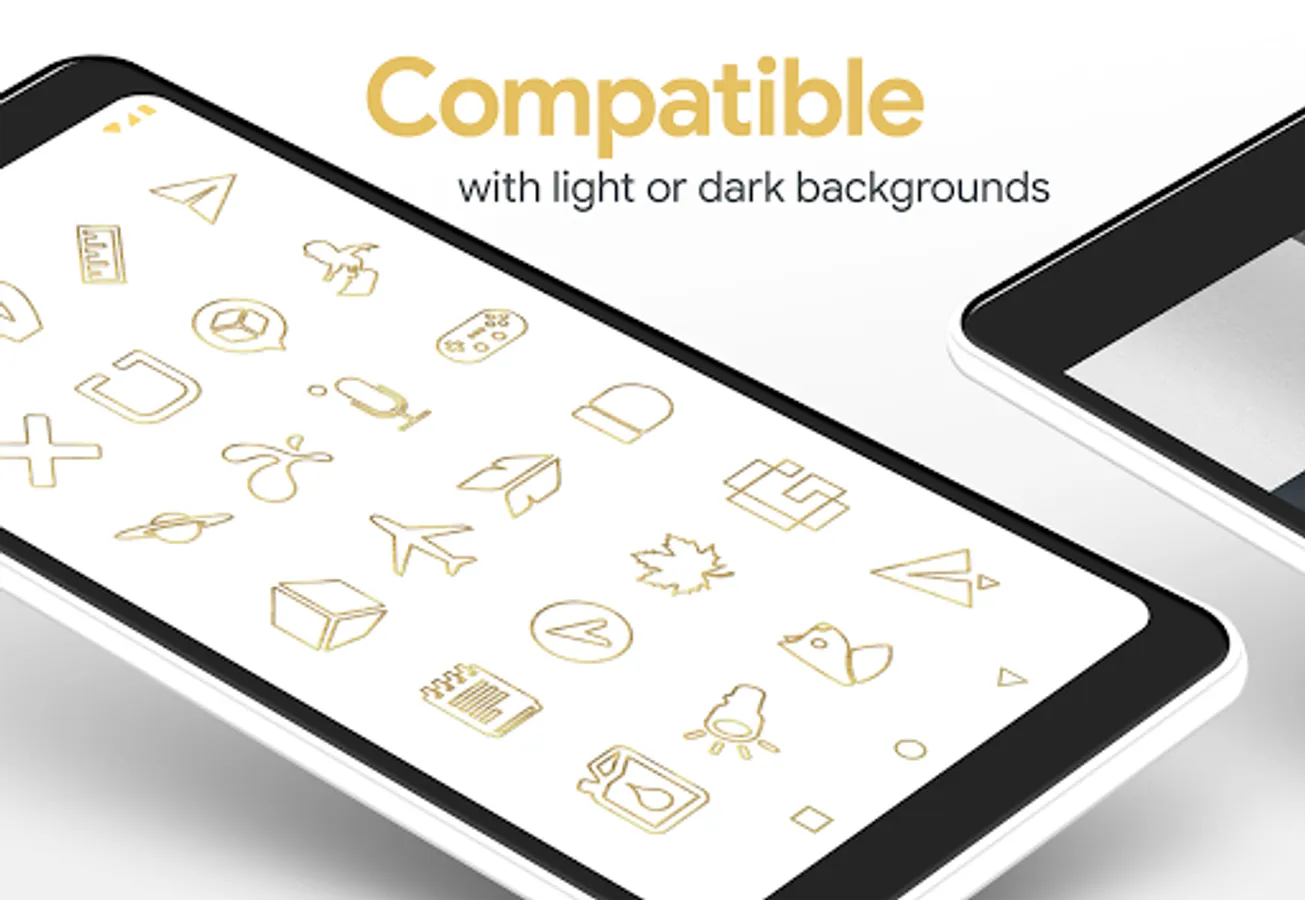 Lines Gold (Free Version) is a simple minimalist, flat & gold texture icon pack with outlined icons that have transparent centers that blend in well with your backgrounds. Gold icons feature clean & flat handmade designs. Color adjusted wallpapers included.