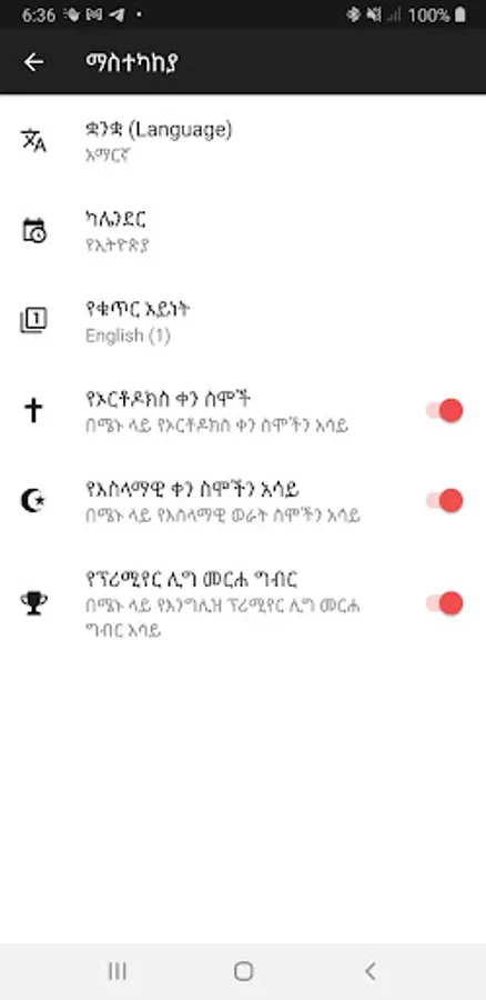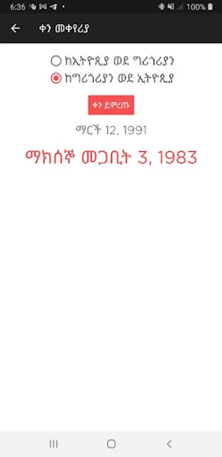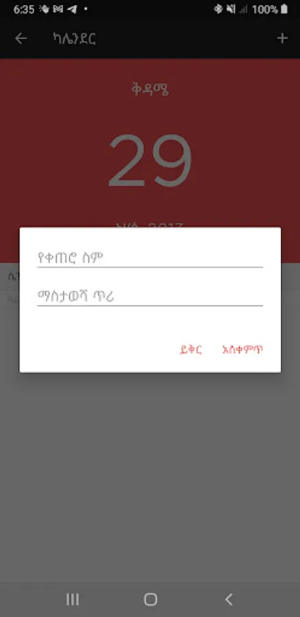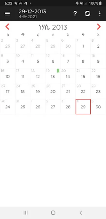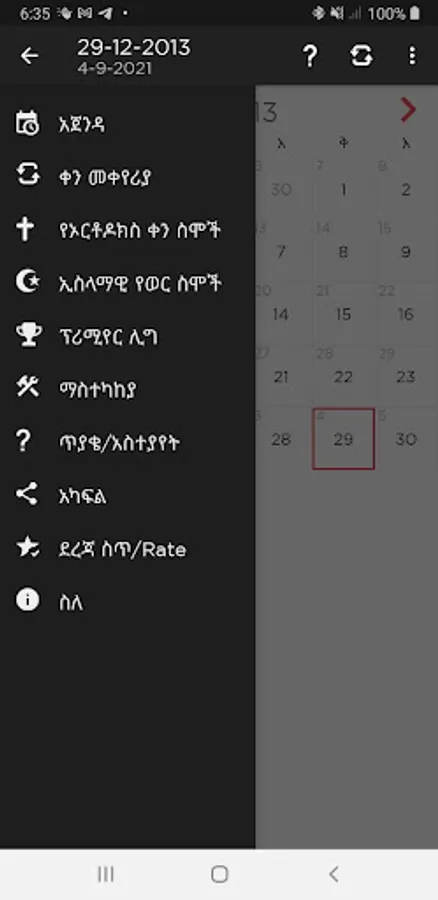 This is an Ethiopian Calendar & date converter available in Amharic, Oromiffa, Tigrinya and English. The calendar displays Christian, Muslim and Ethiopian National Holidays. Users can also add their own appointments with reminders, and days with events are marked with a ribbon. The calendar has two views, 'Month View' and 'Day View'. Users can navigate both views by simply swiping left and right. The easy to use date converter allows converting dates from Gregorian to Ethiopian or vice versa.