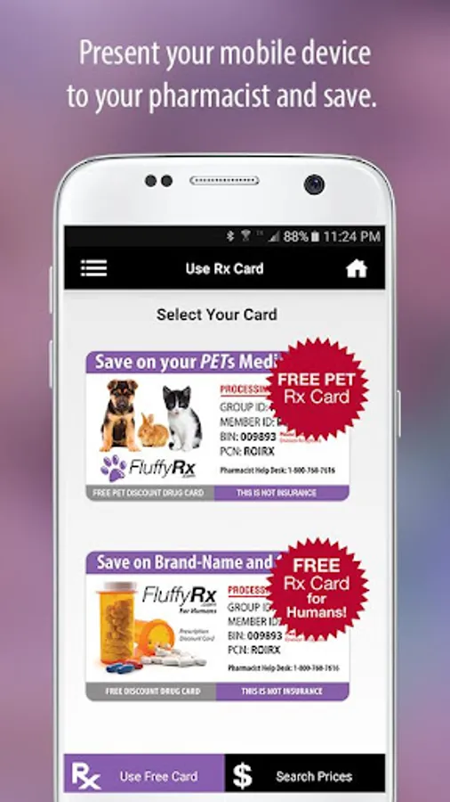 Simply load the Digital Rx card on your mobile device and present it to the pharmacist when purchasing your pets medications. The card is pre-activated and can be used right away. There are no fees, forms or obligations. Save on your prescriptions today.