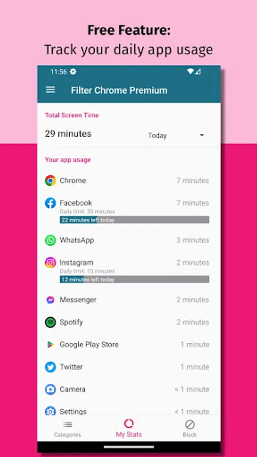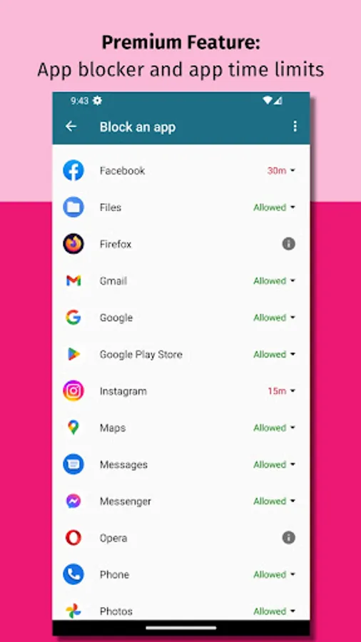 We all spend a tad too much time on our devices and some of us really struggle in putting our devices down. Our app control technology can block or set daily time limits on any installed app on your Android device. Have apps you spend too much time on? Set a daily time limit to break free from time wasting apps in categories such as games, social media and streaming platforms.