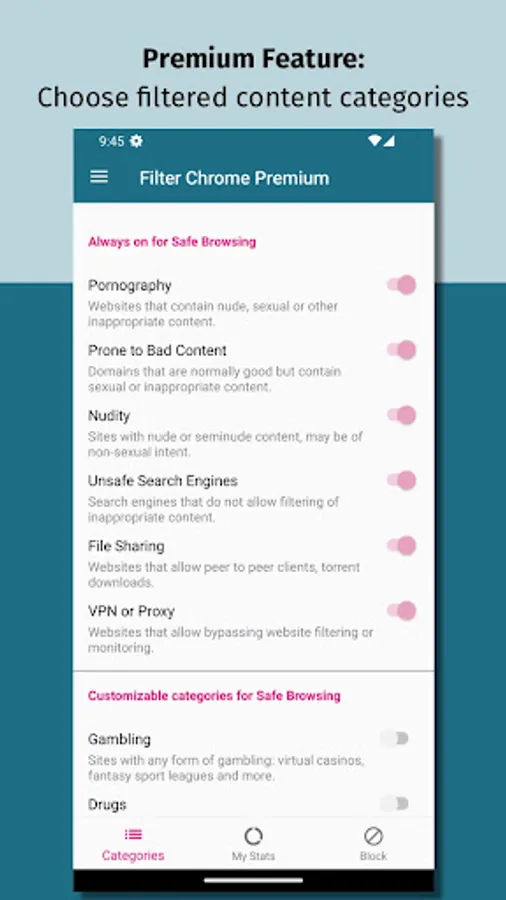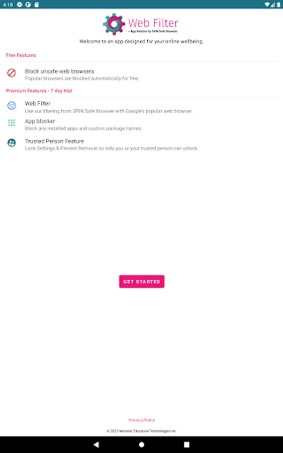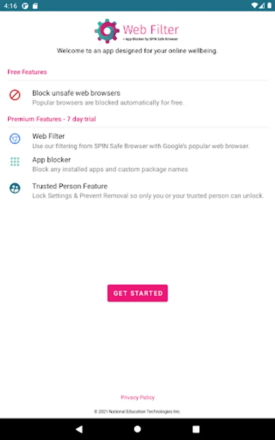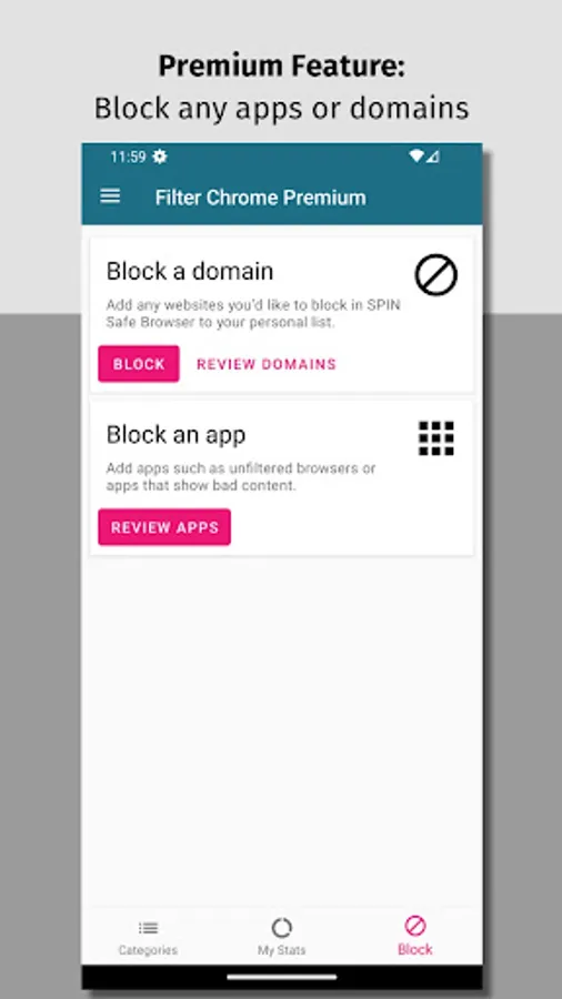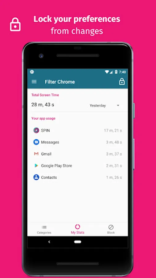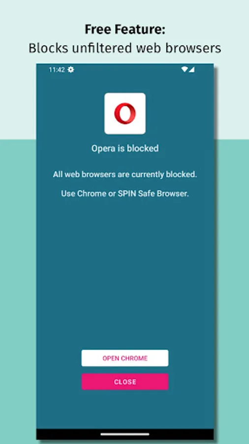 Browse the internet without the worry of accidentally falling onto inappropriate content. Web Filter for Chrome & SPIN blocks all unfiltered web browsers on your Android device. Only our SPIN Safe Browser and Google’s Chrome browser can be used for a safer internet experience.