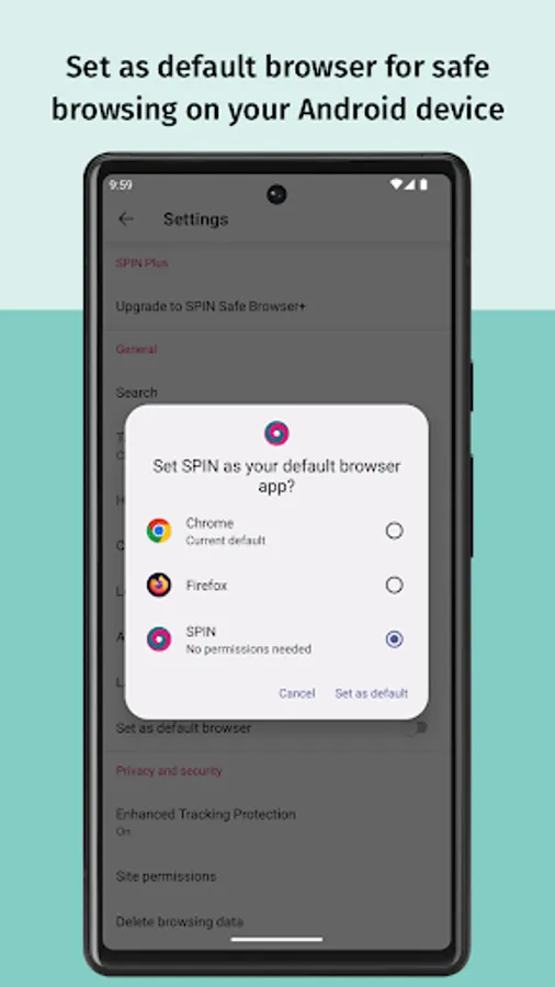 Follow the steps here: https://spinsafebrowser.com/how-to-make-spin-safe-browser-your-default-android-browser