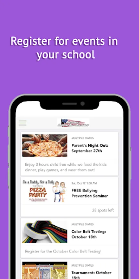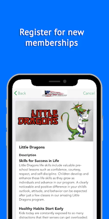 Input your school's code and receive important notifications, view curriculum videos, view class schedules, sign up for special events and memberships, refer friends, and get all pertinent information right on your mobile device.