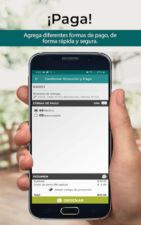 Use your Android device to make the payment from wherever you are or pay in cash when you receive it.
