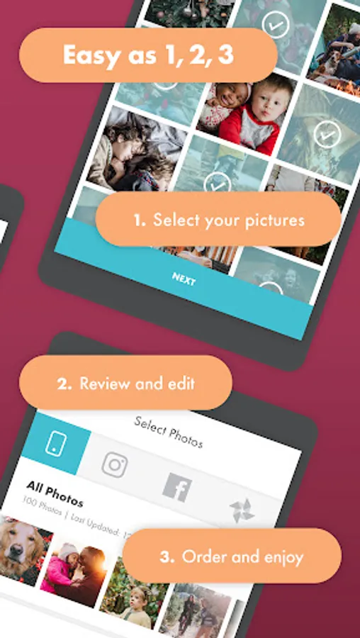 Print your photos in three easy steps. First, upload your photos from your native phone Photos app, Instagram, Facebook, or Google Photos and then, select the photos you’d like to print. Next, review your photos before they are printed – zoom in on the best parts, or edit the crop. Finally, hit checkout – you’re all ready to print the photos that mean the most to you.