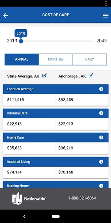 Compare Long-term Care costs from state to state. Select a state and click on the details to display estimated costs for that state. Adjust the region and the length of the types of care to view variations. Select up to two states to compare costs. When finished, you may generate a PDF report.